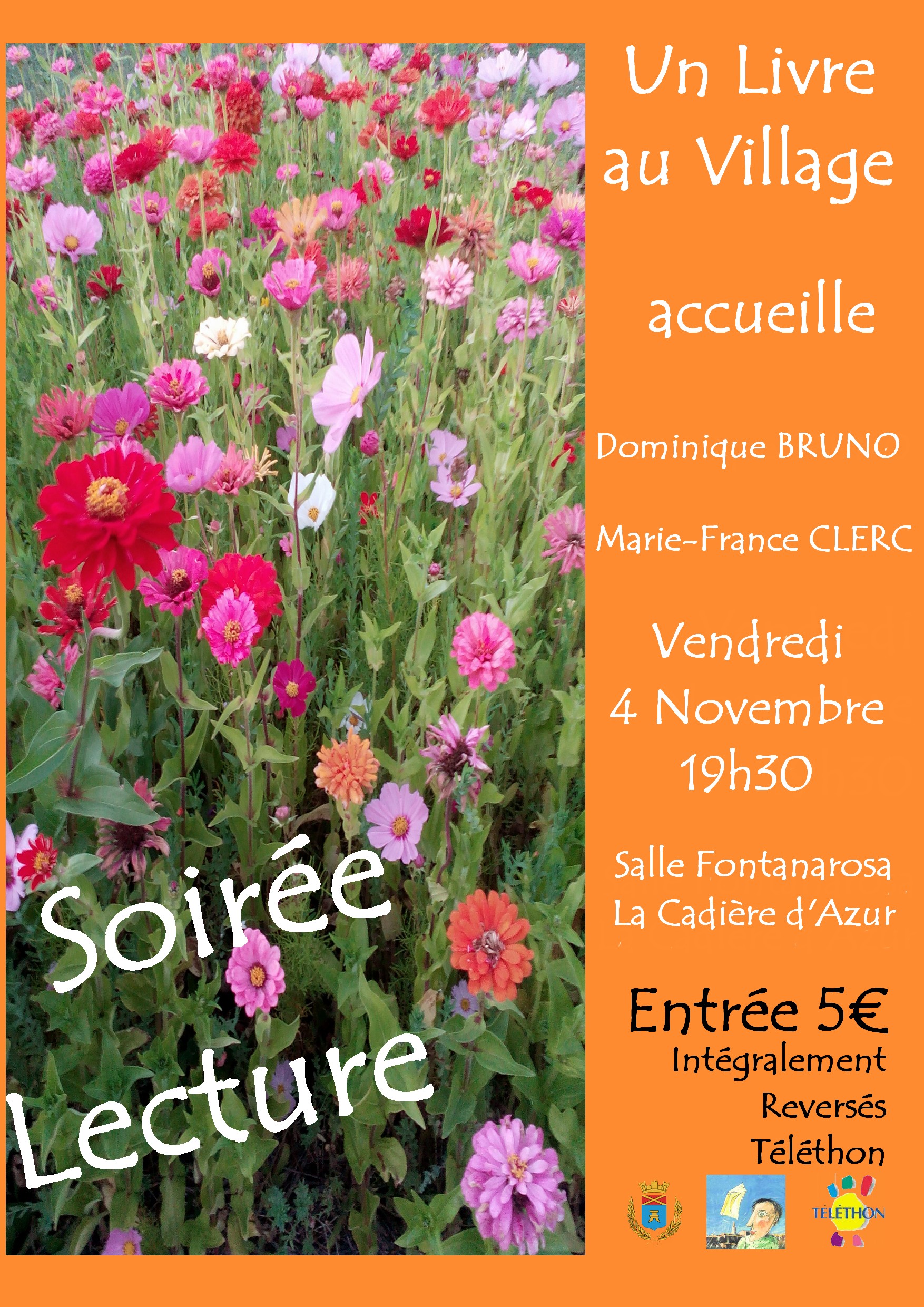 Ce 4 novembre 2016 à la Cadière d’Azur, le groupe de lecture Un Livre au Village présidé par Danielle Joyon a accueilli deux auteurs de romans. La recette de l’entrée exceptionnelle payante, sera versée au Téléthon. J’ai pris la parole après la sympathique Dominique Bruno, et j’ai commencé à présenter Cinq zinnias pour mon inconnu en lisant quelques extraits…