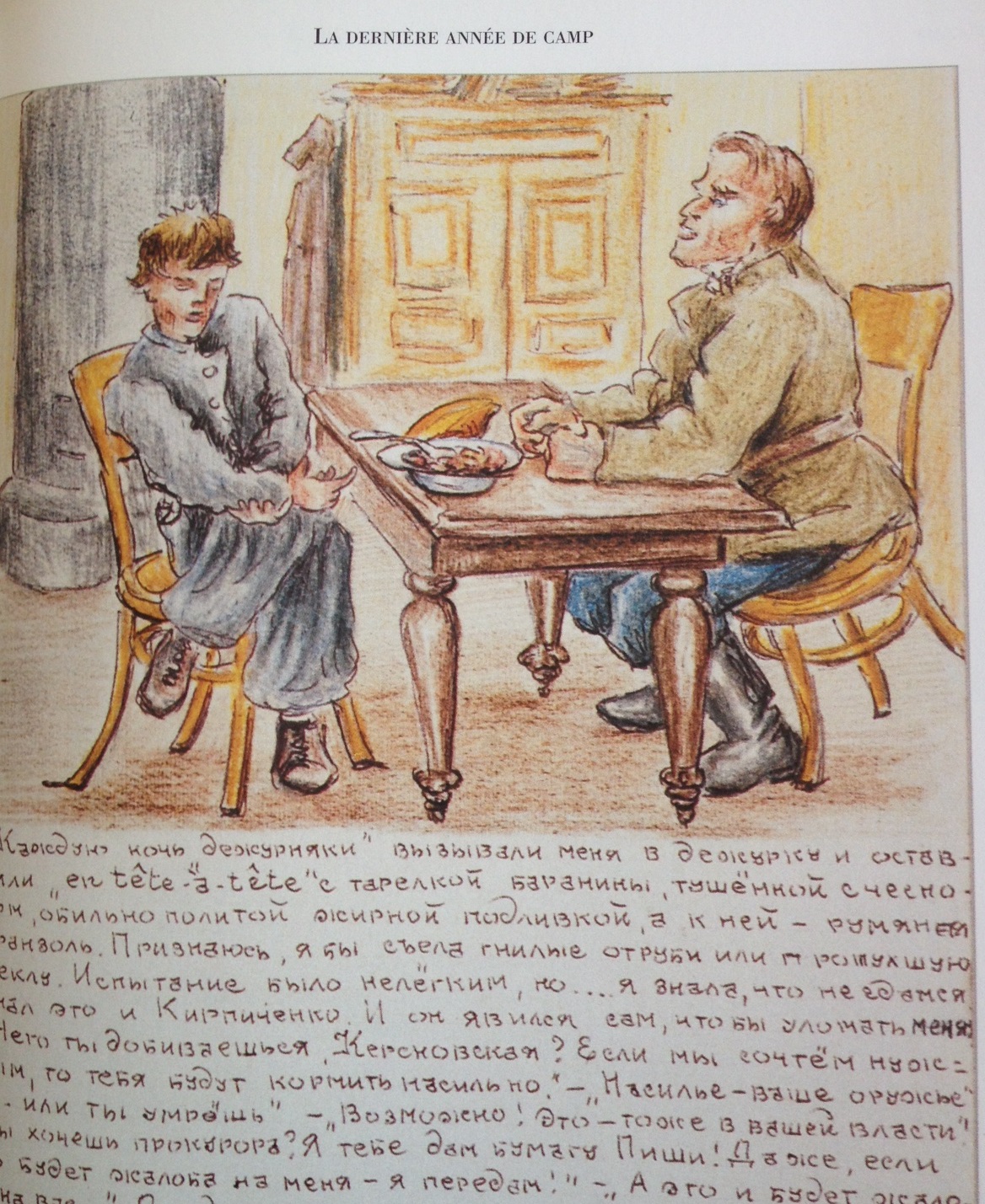 « Chaque nuit, les gardiennes m’amenaient dans la salle de garde et me laissaient en « tête à tête » avec une assiette de mouton à l’ail abondamment arrosée de sauce bien grasse, le tout accompagné d’une brioche dorée. Or, je l’avoue, j’aurais été capable d’avaler du son moisi et de la betterave pourrie ! L’épreuve était dure, mais je savais que je ne céderais pas.